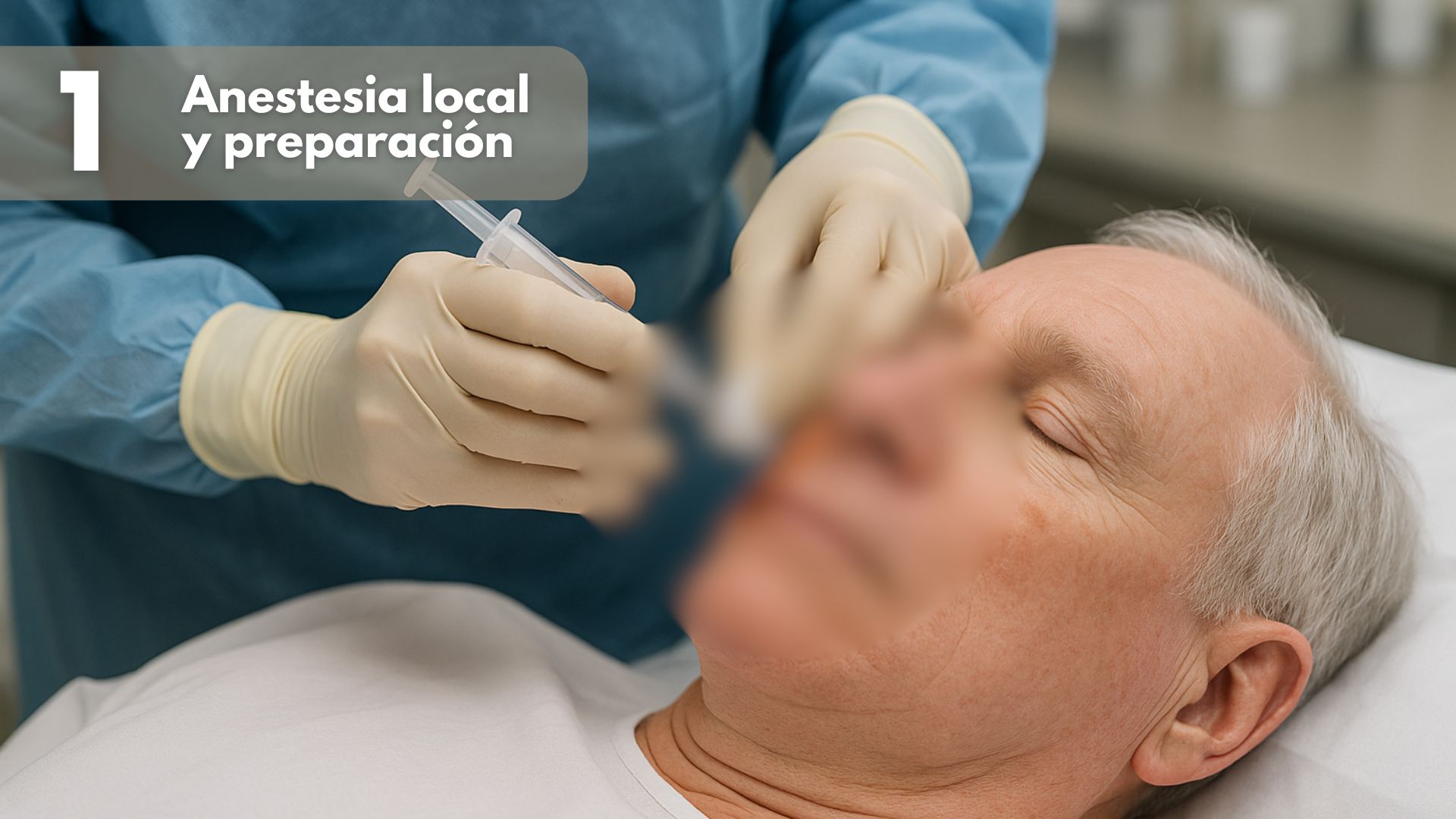 Anestesia local y preparación: se limpia la zona afectada y se administra anestesia local para insensibilizar el área a tratar. El paciente permanece despierto pero sin dolor durante todo el proceso.