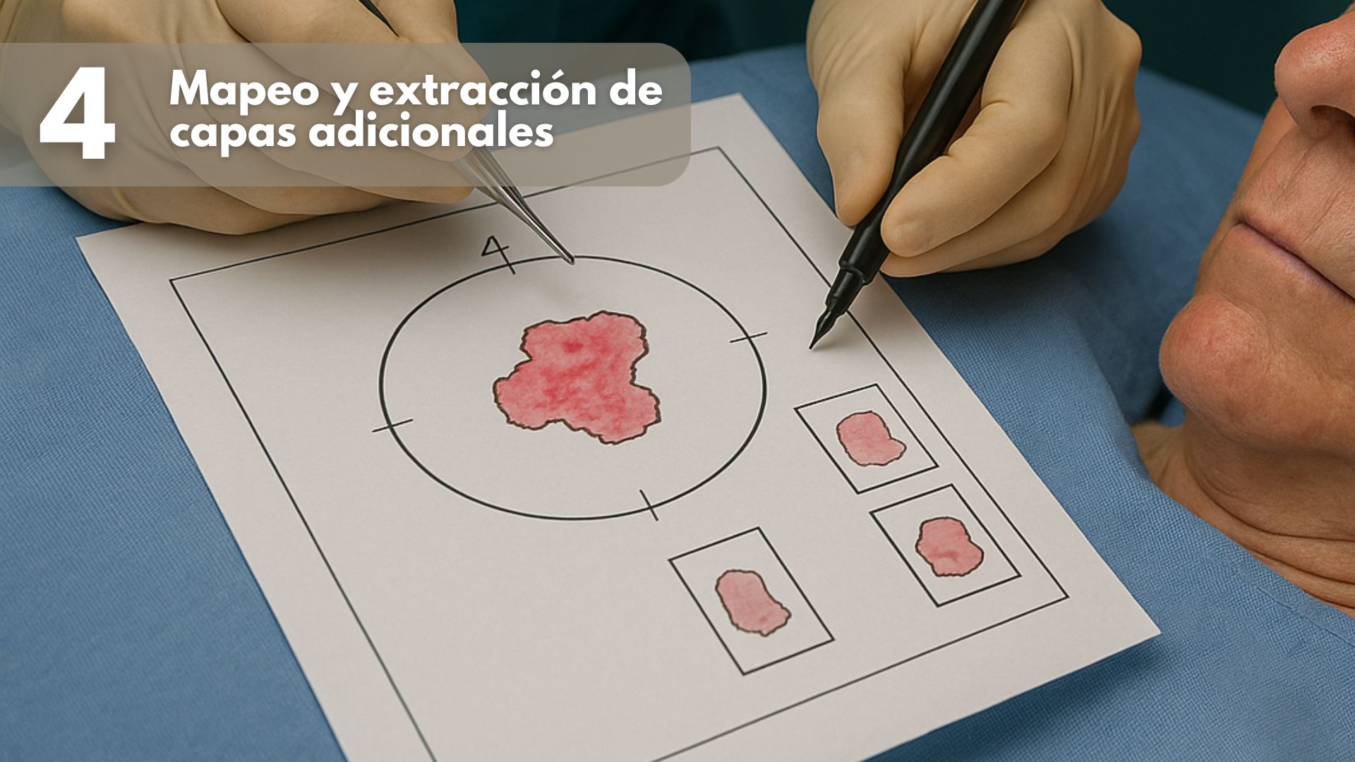 Mapeo y extracción de capas adicionales: si el análisis muestra presencia de cáncer residual, el cirujano marca en un mapa la ubicación exacta de esas células y extirpa de la zona afectada una capa adicional de tejido. Luego, la nueva muestra se analiza nuevamente al microscopio.