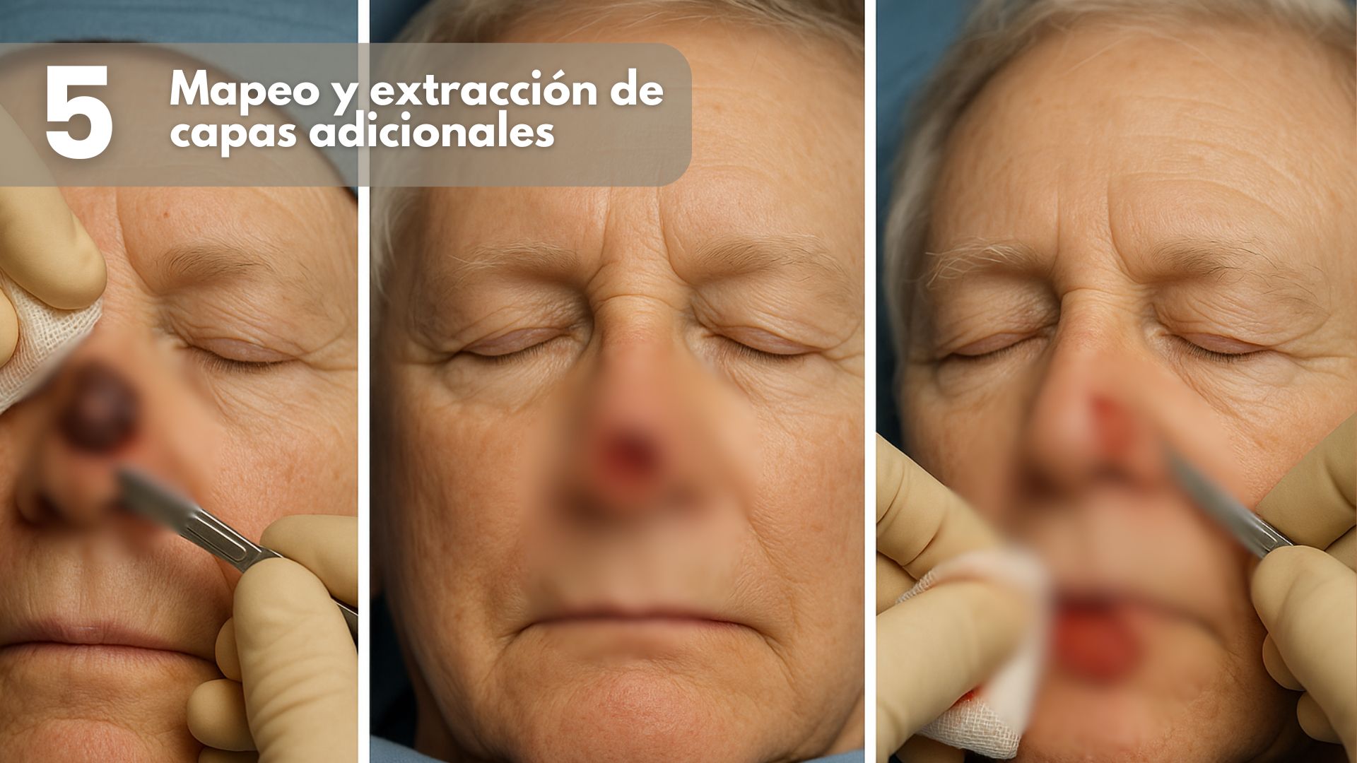 Repetición hasta obtener márgenes libres y reconstrucción: se repiten los pasos de análisis y extirpación por etapas hasta eliminar todo el tejido canceroso. Una vez que los márgenes están libres de cáncer, el cirujano procede a cerrar o reconstruir la herida.